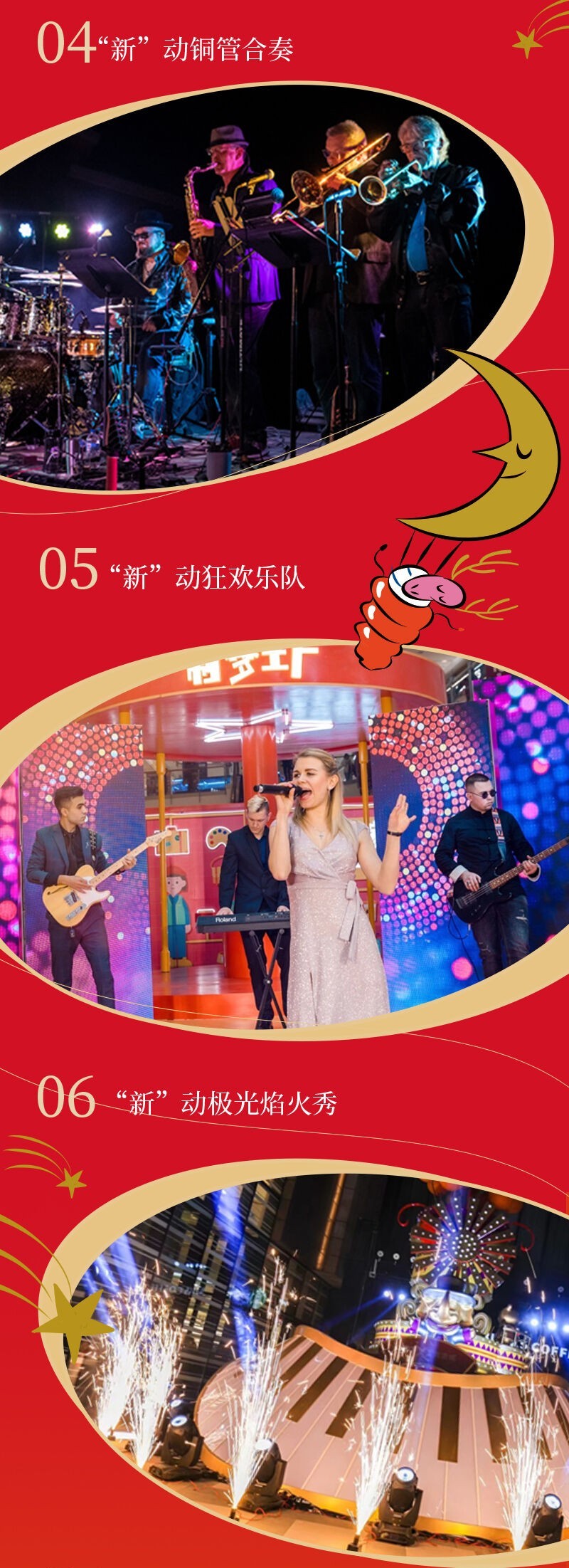 舞狮迎新、财神送福、极光烟火秀、无人机秀、浪漫冬雪秀、音乐剧、铜管合奏……