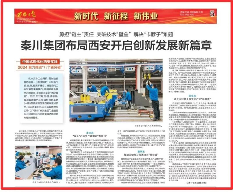 2月5日,西安日报刊发稿件《秦川集团布局西安开启创新发展新篇章》,报道了秦川集团布局沣西新城勇担“链主”责任,加速工业母机国产替代。