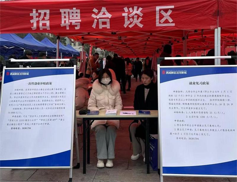 同时,现场还设置了泾河新城“乐居乐业”政策宣讲区、企业招聘洽谈区以及直播带岗“线上”服务区等多个服务专区,多维度为企业、群众搭建供需对接平台。
