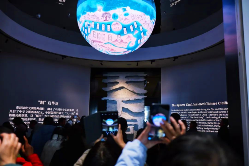 该主题展最突出的创新点之一,是主、辅两条线平行叙事、相互呼应。主线以新制度创建为核心,从政治制度、经济发展、思想奠基、文化创新、科技助力、交流互鉴6个板块,分述秦汉文明在中华文明发展进程中的地位,充分展示其发展的程度与高度。辅线则将秦汉文明置于世界文明发展大视角下,阐释秦汉文明和同时代其他世界文明的区别,展现其在世界文明大框架里独有的魅力。