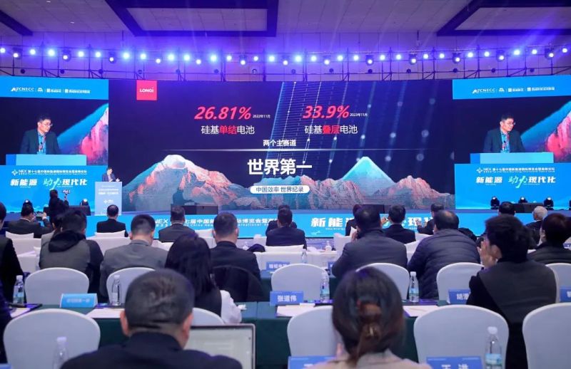 2023年11月23日,在第十七届中国新能源国际博览会暨高峰论坛上,隆基绿能董事长钟宝申出席论坛并宣布,隆基绿能之前打破的晶硅单结电池(26.81%)和晶硅-钙钛矿叠层电池(33.9%)两项电池效率世界纪录最近被收录在美国国家可再生能源实验室(NREL)的《太阳电池最高研究效率图》中。隆基成为两大电池赛道效率世界纪录的“双料冠军”。