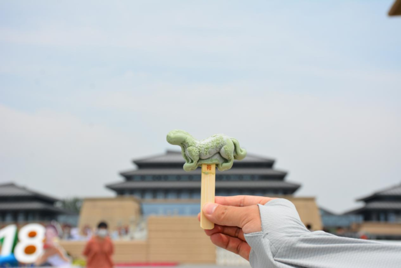 瓦当咖啡的文创纪念品内容丰富、造型精致,有蚕丝皂、文创丝巾、网红文物“鎏金走龙”1:1复刻纪念品等数量众多的陕历博馆藏文物文创周边,更有以杜虎符、金怪兽、镶金兽首玛瑙杯等为原型制作的5种口味文创冰激凌,深受游客欢迎。