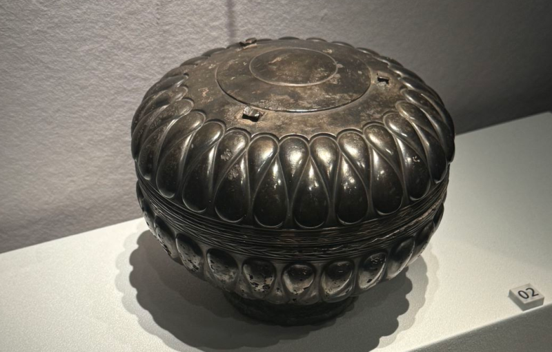 银盒呈扁球形,盖与盒身上采用锤鍱工艺制成对向交错的蒜头形凸纹。这种工艺与纹饰、造型带有古代西亚波斯银器的特点,与中国本土的不同。专家认为这是一件海外舶来品,说明广州是中国古代海上丝绸之路的重要发祥地。