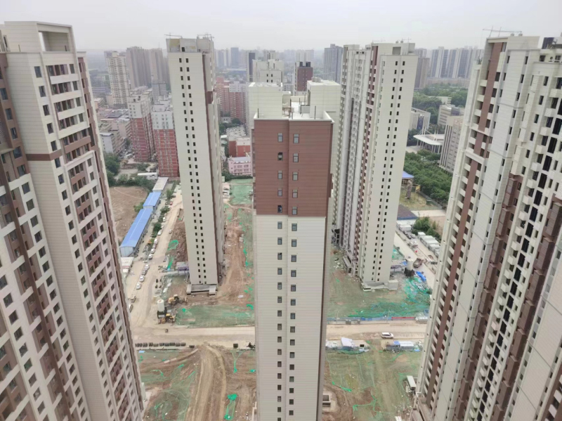 沣明苑项目15栋住宅楼主体结构均已封顶,砌体结构基本完成,正在进行屋面防水、窗框安装及水电安装等施工。