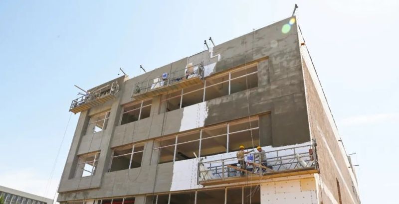 “地上二层、三层已完成内墙乳胶漆粉刷,目前主要进行一层内墙乳胶漆粉刷和外墙抹灰施工,以及水、电、消防、通风等工程安装。”项目负责人说。