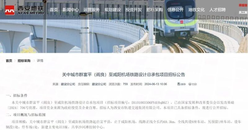 关中城市群富平(阎良)至咸阳机场铁路项目,即关中城市群核心区城市轨道交通线网规划中的“西安地铁17号线”。招标信息透露,该线路起自富平县、止于西安咸阳国际机场,正线全长约69.3公里,全线共设8座车站,另预留1座车站。