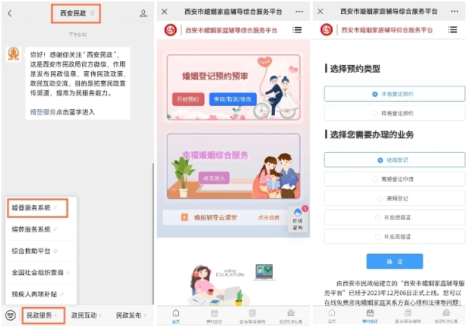 微信搜索“西安民政”公众号-关注后点击民政服务-婚登服务系统-婚姻登记预约预审-选择预约类型及需要办理的业务,按照提示上传相关资料,等待审核即可。