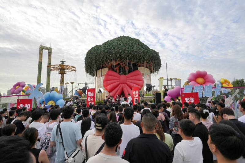 恰逢七夕,乐华城策划了花车巡游、粉色气球雨、盲盒配对交友等一系列浪漫活动,迎来了一波又一波来自各地的游客。活动现场人潮涌动,热闹非凡。广场舞台前,围满了前来观看的游客,大家都想找到一个最佳观看位置,能够跟“王婆”近距离互动。