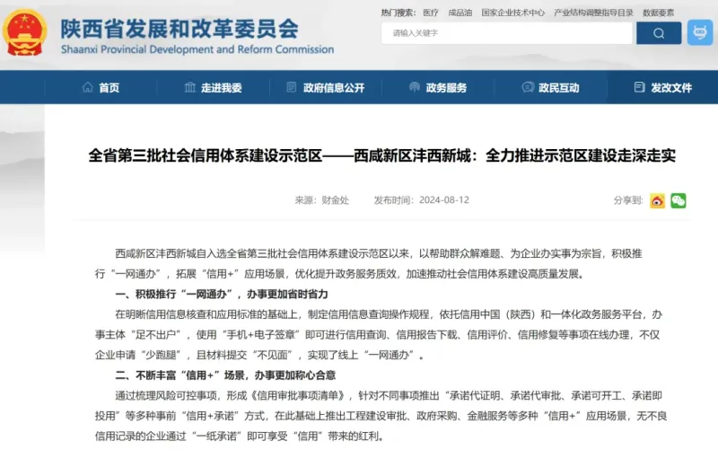 近日,陕西省发展和改革委员会官网发布稿件《全省第三批社会信用体系建设示范区——西咸新区沣西新城:全力推进示范区建设走深走实》,关注沣西新城积极推行“一网通办”,拓展“信用+”应用场景,优化提升政务服务质效,加速推动社会信用体系建设高质量发展。