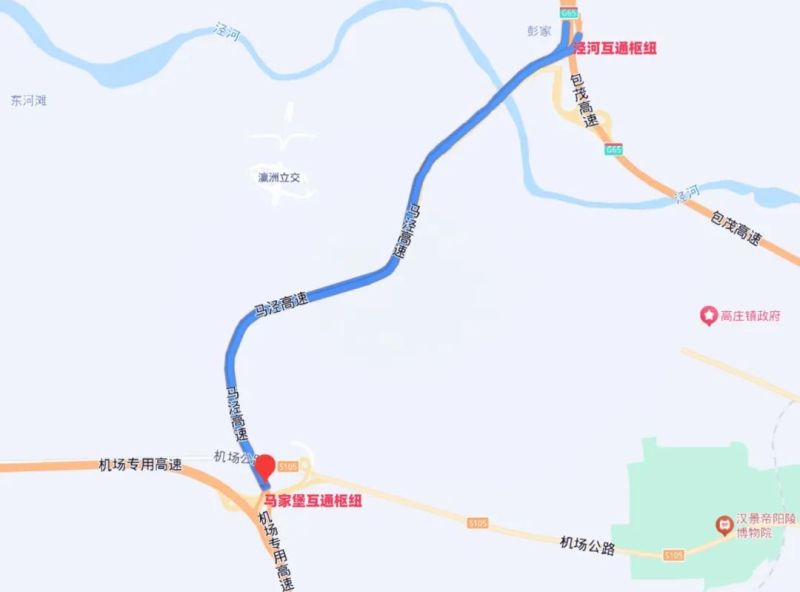 马家堡至泾阳高速公路(简称“马泾高速”)路线起于西咸新区秦汉新城马家堡互通枢纽,与西安咸阳国际机场专用高速相连接,向北沿秦汉国际马术中心西侧及北侧布设,跨越茶马大道后继续往东北方向延伸,最终止于泾河互通枢纽,与包茂高速连通。