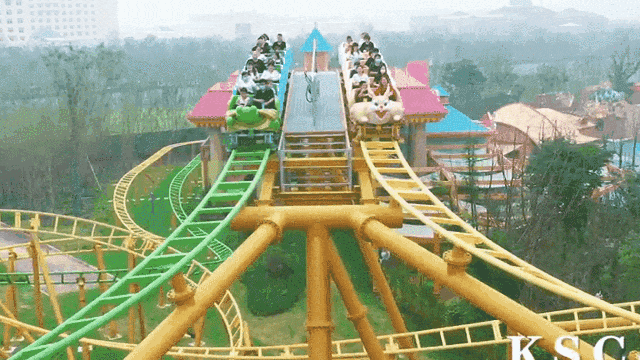 龟兔赛跑,龟兔赛跑双轨过山车融入龟兔赛跑的故事,黄色和绿色赛道分别代表兔子和乌龟。游客乘坐其中,双车同时出发,体验侧旋、俯冲转弯、快速滑翔。