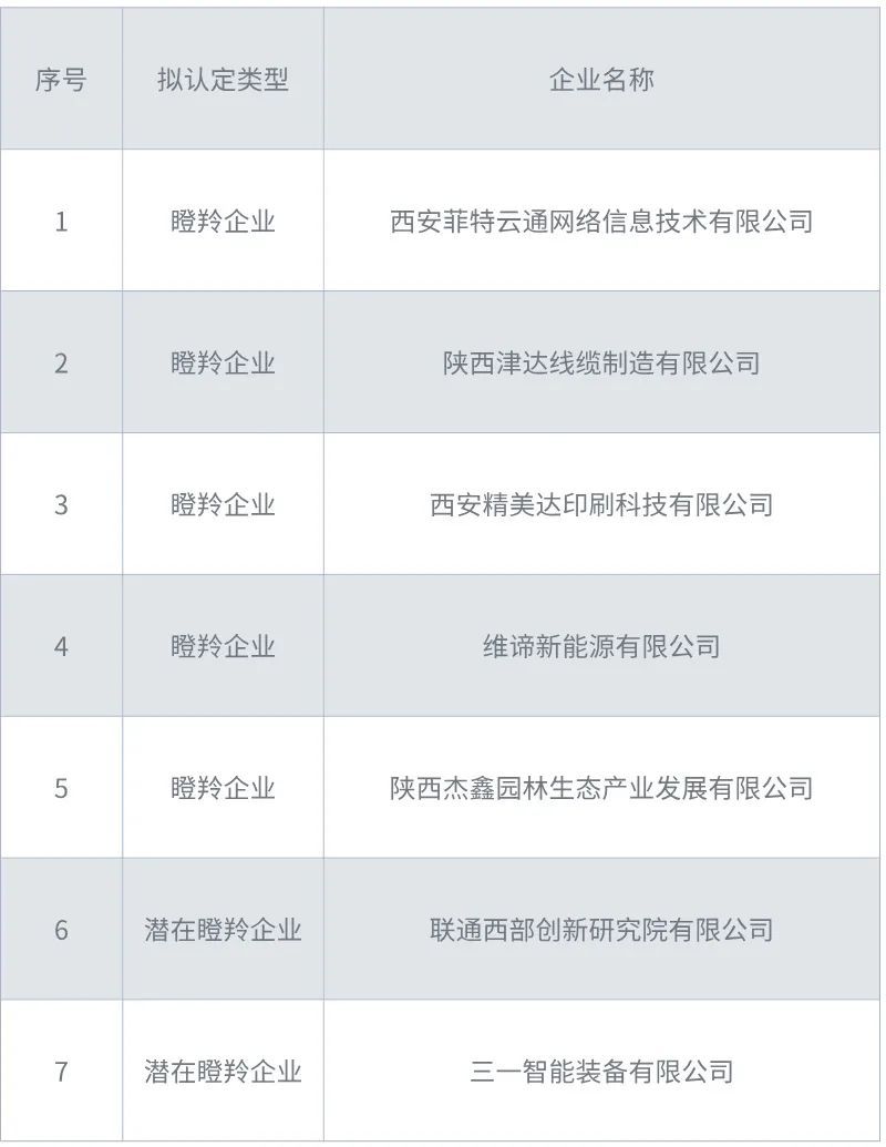 近日,2024年拟认定陕西省瞪羚企业及潜在瞪羚企业名单公示,沣西新城7家科技型企业榜上有名,其中瞪羚企业5家,潜在瞪羚企业2家。