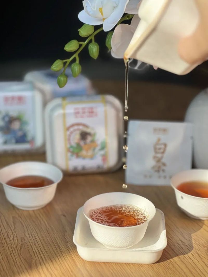 “茯茶一刻”,顾名思义,象征着即刻享受茯茶的美妙时光。作为一次性茶具,它设计精巧、便于携带,精致的工艺与质感使得茯茶的冲泡更加顺畅。茶具材质选用食用竹浆与甘蔗浆料,耐高温且环保健康,为茶客提供纯天然原料,入口健康。一套泡茶器、三个茶杯、一包金花陈皮白,无论是作为纪念品收藏,还是直接携带于茶盒中,与好友共赴露营、旅行之约,都是理想之选。