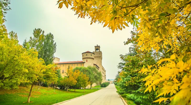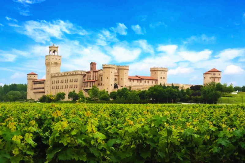 张裕瑞那城堡酒庄采用意大利托斯卡纳建筑风格,4.2万平方米意式城堡,以明黄色为主,原始石块堆砌,红瓦铺顶。漫步庄园,绿意盎然,葡萄长廊与生态水系相映成趣,多个特色鲜明的室外主题广场,浪漫又休闲,让你不出国门就能领略到独特的欧式风情。