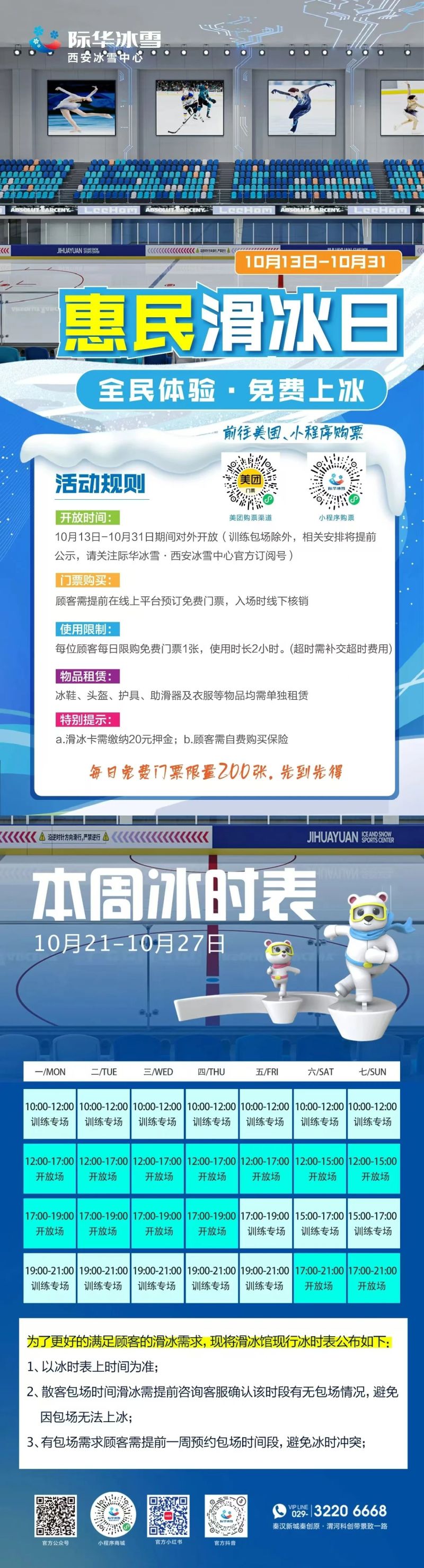 即日起至10月31日,际华冰雪·西安冰雪中心推出“全民体验·免费上冰”惠民滑冰日活动。广大市民游客可在美团或际华冰雪小程序免费领票,每日免费门票限量200张,每位顾客每日限购免费门票1张,使用时长2小时。