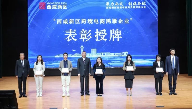 空港新城区内企业陕西星空供应链管理有限公司、陕西丝路港外贸服务有限公司、陕西众维云创运营服务有限公司被授予“西咸新区跨境电商鸿雁企业”牌匾。陕西西咸空港综合保税区跨境电商产业园被授予“西咸新区跨境电商产业园区”牌匾。