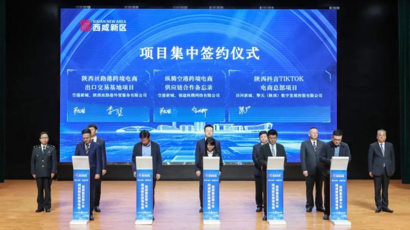 现场,空港新城与陕西丝路港外贸服务有限公司进行签约,双方将在空港新城共同建设陕西丝路港跨境电商出口交易基地项目,同时,空港新城与福建纵腾网络有限公司签署纵腾空港跨境电商供应链合作备忘录,双方将在海外仓储、跨境物流等方面进行深度合作。