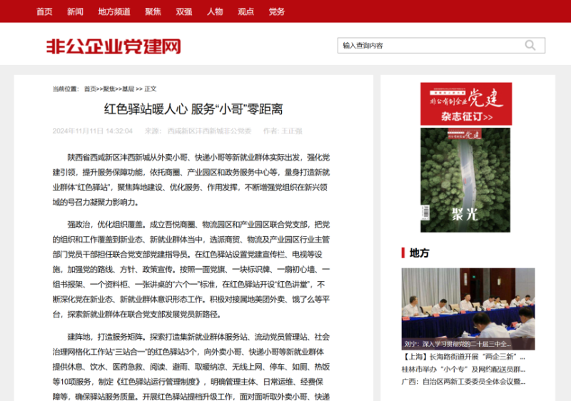 近日,全国党建研究会非公有制经济组织党建研究专业委员会主办的非公企业党建网刊载沣西新城非公党委典型案例《红色驿站暖人心 服务“小哥”零距离》,专题报道沣西新城依托商圈、产业园区和政务服务中心等场地,聚焦外卖小哥、快递小哥等新就业群体,量身打造“红色驿站”,不断强化党建引领,有效增强党组织在新兴领域的号召力、凝聚力、影响力的创新举措。