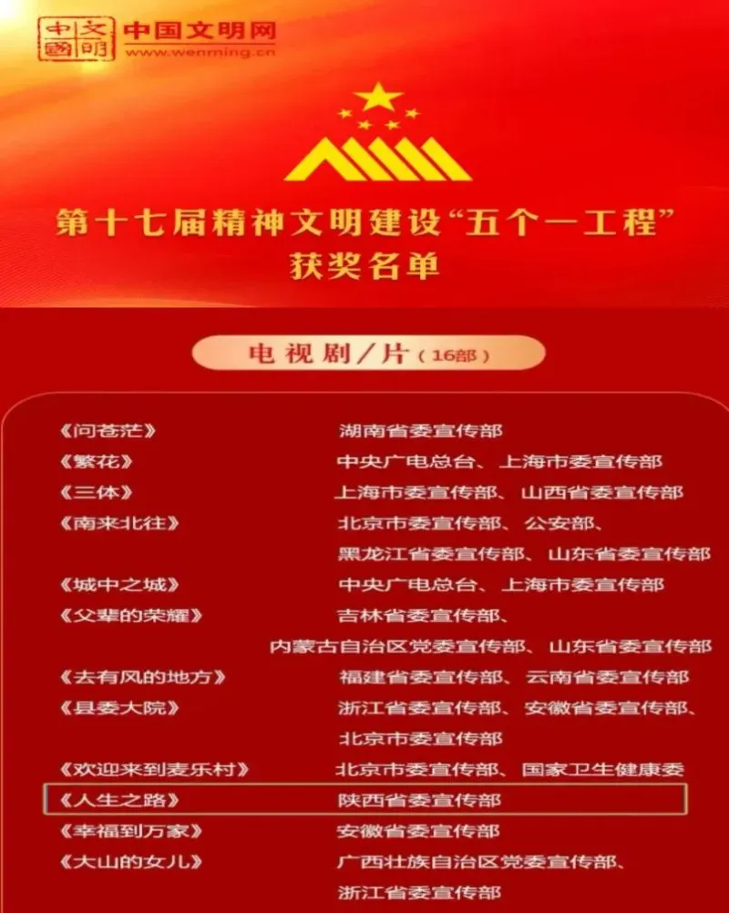 秦汉新城影视文化产业基地入驻企业,陕西领颂时光文化传媒有限公司联合出品的电视剧《人生之路》,获得中共中央宣传部第十七届精神文明建设“五个一工程”优秀作品奖。