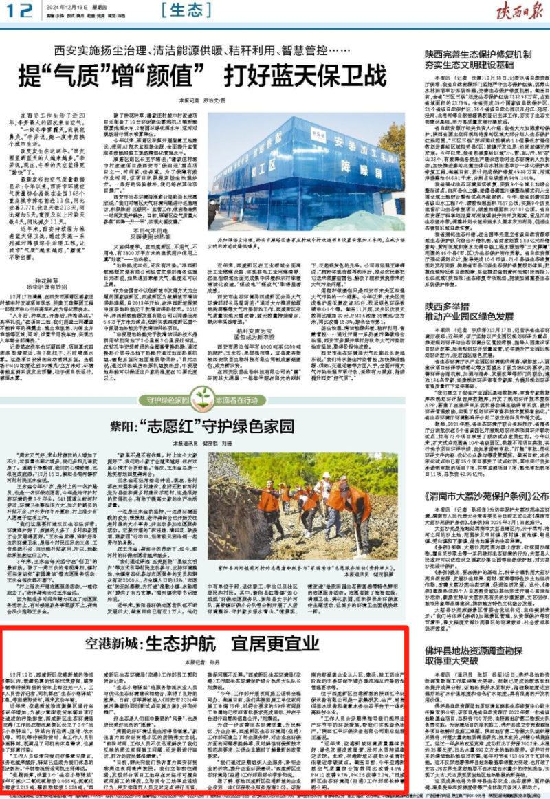 12月19日,陕西日报以《空港新城:生态护航 宜居更宜业》为题聚焦空港新城生态保护。