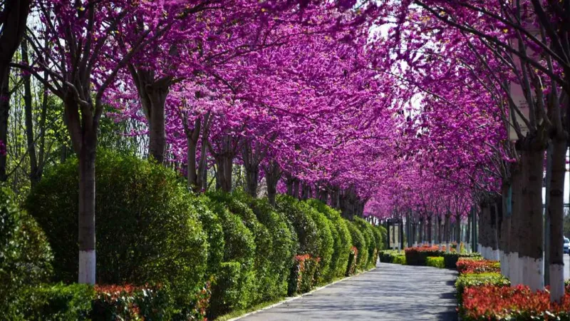 春分刚过,秦汉新城兰池二路已染成一片紫红,枝头紫荆花挤挤挨挨,远望如云霞铺展,这片花海就在西咸新区秦汉中学校门外,与琅琅书声相伴,绘出熙春画卷。