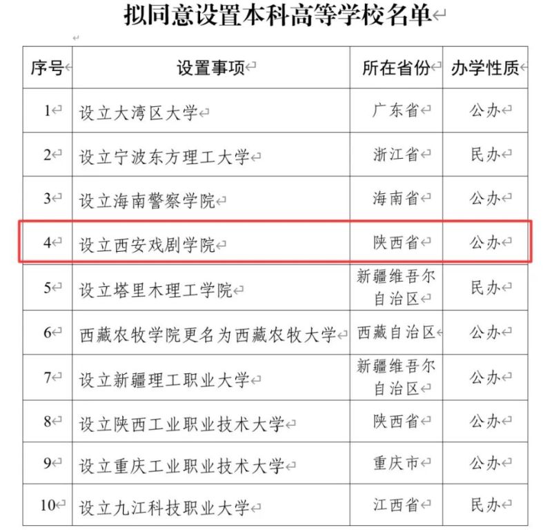6月11日,教育部官网发布关于拟同意设置本科高等学校的公示,备受社会关注的西安戏剧学院也在公示名单之列。