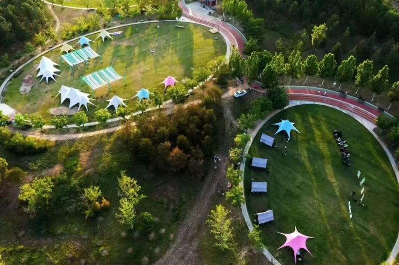 当暮色四合,渭河披上星月纱衣。草坪茵茵,五彩天幕如花绽放,帐篷点缀其间,勾勒都市人向往的野趣图景。