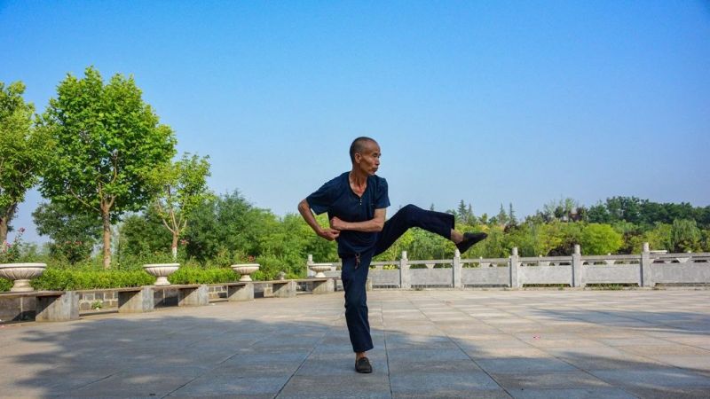 转头来到公园的另一边,王大爷正在踢腿练功。他身形精瘦,轻轻松松就能把腿尖踢过头顶,坐在树荫下休息的“观众团”露出赞许的目光。待他练罢,旁边的大爷也纷纷亮出绝活:程大爷的拳法行云流水,聂大爷的拳法刚劲有力,汤大爷的刀法凌厉迅猛……看得人眼花缭乱。