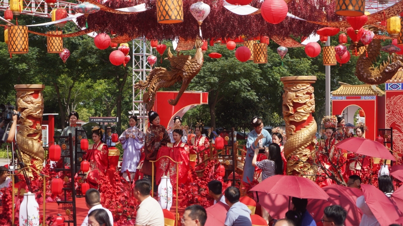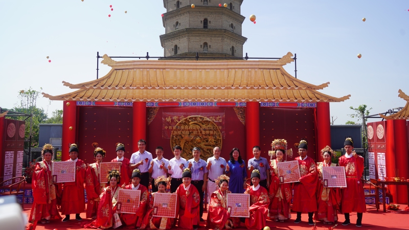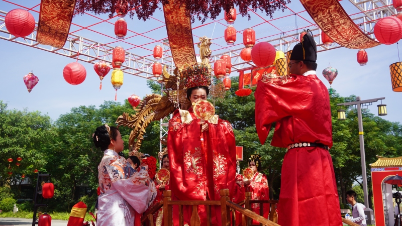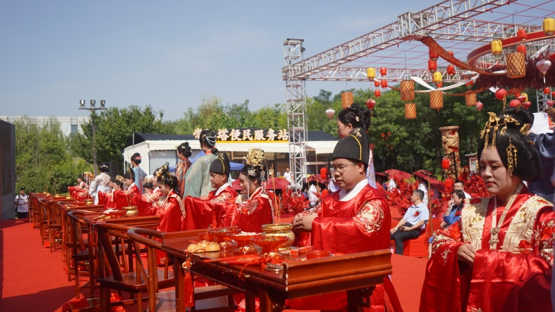 崇文古塔,处处流淌着古风遗韵弥漫着浪漫气息。当天正午,身穿红色明制中式礼服的新人们缓缓步入会场中央,进行了执出阁礼、沃盥礼、同牢礼、合卺礼、结发礼、对拜礼等仪式,共同携手许下爱的诺言。在庄重不失活泼的中式浪漫氛围中,七对新人从此开启人生新篇章,共同创造美好幸福的明天。