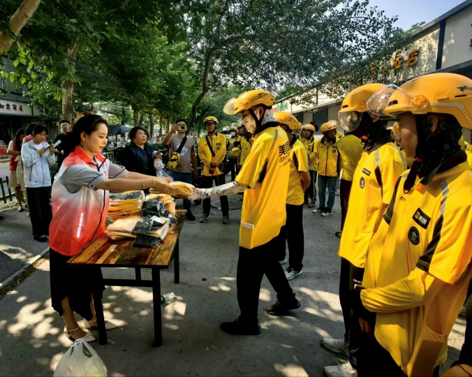 “717骑士节”当天,三桥街道以“送清凉·助治理·共前行”为主题,举办“联新桥”志愿行动启动仪式。来自辖区8个社区(村)的志愿者为外卖小哥送上花露水、藿香正气水、透气短袖等防暑衣物。同时组织骑手代表进行座谈交流,重点宣讲参与志愿服务、融入基层治理的政策要求,详细介绍快递外卖员可灵活参与的志愿服务项目以及服务积分兑换制度,现场征集小哥意见建议和困难诉求,帮助他们解决配送“最后100米”难题的同时鼓励引导其发挥自身优势、参与社区治理,实现社区与新就业群体的“双向奔赴”。
