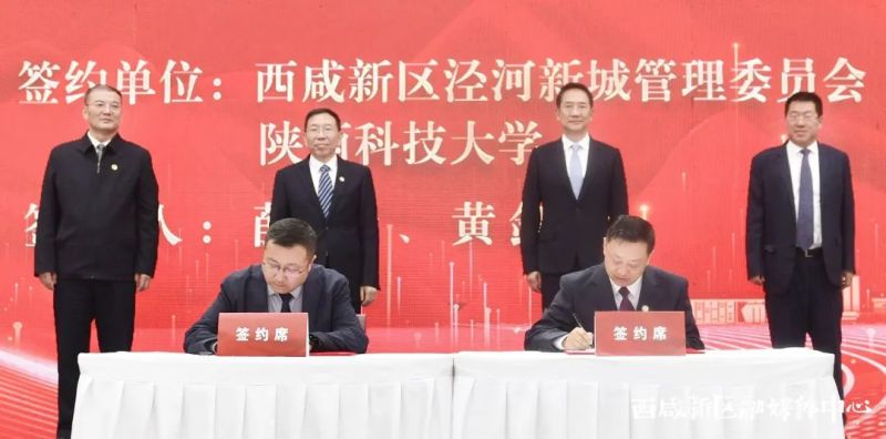 西咸新区党工委书记杨仁华、陕西科技大学党委书记姚书志,陕西科技大学校长李志健,泾河新城党委书记、管委会主任张宏伟,陕西科技大学副校长黄剑锋出席并见证签约。