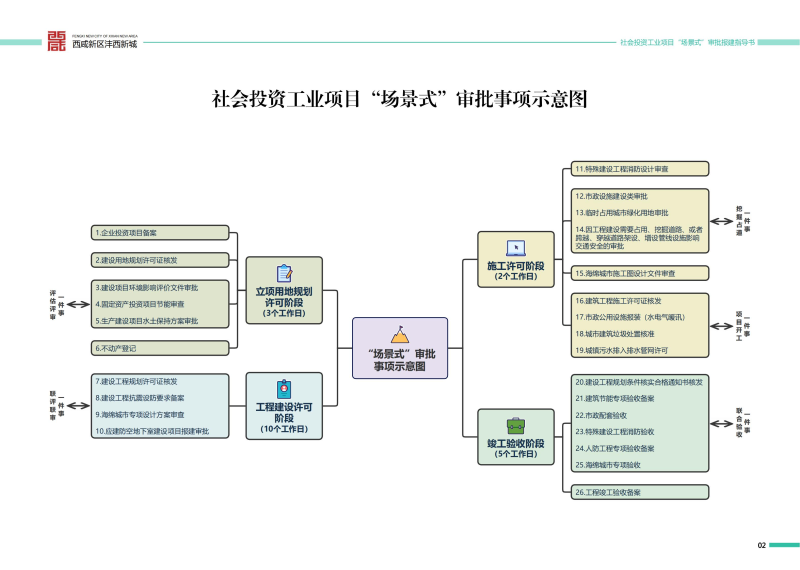 为持续深化全省“三个年”活动要求,西咸新区沣西新城积极落实《西安市强化项目服务保障优化营商环境工作方案》要求,在工程建设项目领域推行“一件事”场景式服务,出台《西咸新区沣西新城社会投资工业项目“场景式”审批报建指导书》(以下简称《指导书》),引导企业高效完成审批报建流程,助力新城经济高质量发展。