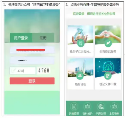 办理人可通过关注《健康陕西发布》微信公众号,注册并登录账号,按照如下步骤完成办理: