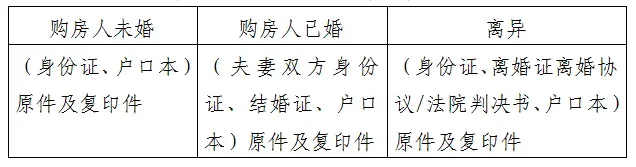 离异---(离婚证离婚协议、调解书附送达回证,判决书附生效文书、户口本首页及本人页、身份证)复印件,个人西咸新区住房情况查询结果(若有未成年子女并判给本人,需提供子女的西咸新区住房情况查询结果证明)