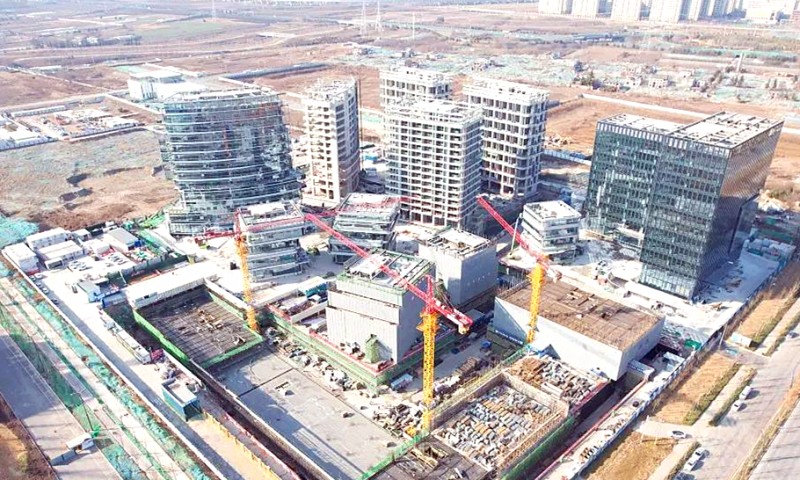 目前,项目主体结构已全面封顶。在设计、建设过程中,项目采用近零能耗设计建筑技术,在建筑综合节能率、建筑本体节能率以及可再生能源利用率上远超传统建筑,泊跃人工智能产业园项目(西塔)于2023年11月获得“近零能耗建筑设计标识”认证。