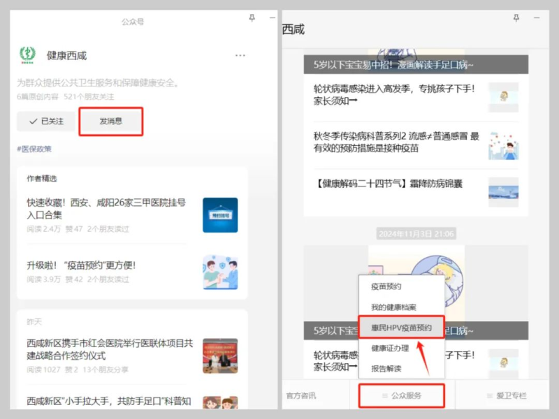(1)搜索“健康西咸”公众号,点击“发消息”,进入菜单栏页面,点击“公众服务”,选择“惠民HPV疫苗预约”,即可进入“知苗易约”小程序。