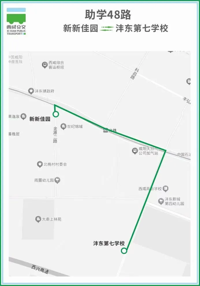 由“新新佳园”始发,途径世纪大道东段、沣东路,至“沣东第七学校”,线路全长1.6公里。