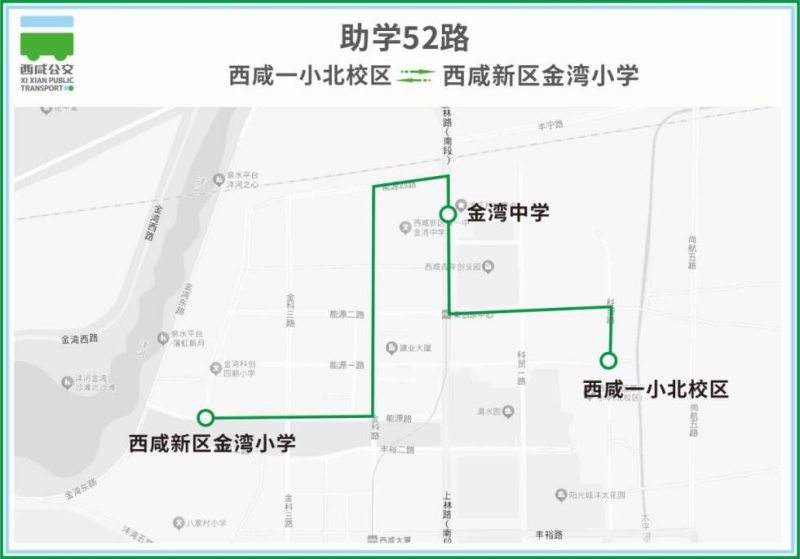 该线路由“西咸一小北校区”始发,途径能源一路、上林路南段,至“西咸新区金湾小学”,线路全长3.4公里。