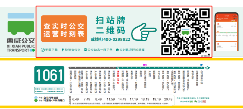 “西周大道·沣东三路口”站及“沣东第一学校”站分别为1061路开往“白马河地铁站”方向的起点站和中途站,从站牌处公示的信息可知,车辆在起点“西周大道·沣东三路口”站的发车时间分别为6:30、7:30、8:30、11:40、14:30、17:00、18:00、19:00、20:30,到达中途“沣东第一学校”站的时间分别为6:49、7:49、8:49、11:59、14:49、17:19、18:19、19:19、20:49。