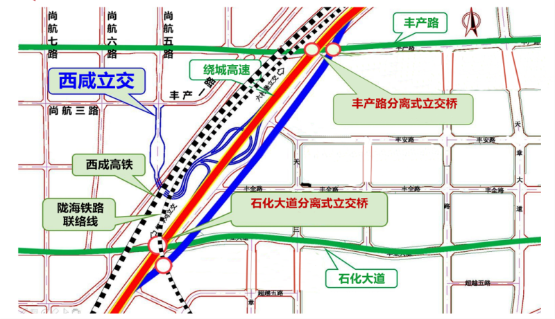 石化大道分离式立交和丰产路分离式立交均为绕城高速西咸互通式立交项目的一部分,均采用双向6车道设计,满足桥梁下方市政道路规划红线宽度,2020年9月开工建设,今年3月底建设完成。通车后,群众到西咸新区管委会和能源金贸区办事更加方便,经由该段路线(石化大道、丰产路)前往西咸新区沣东新城和西安主城区也更加便捷。