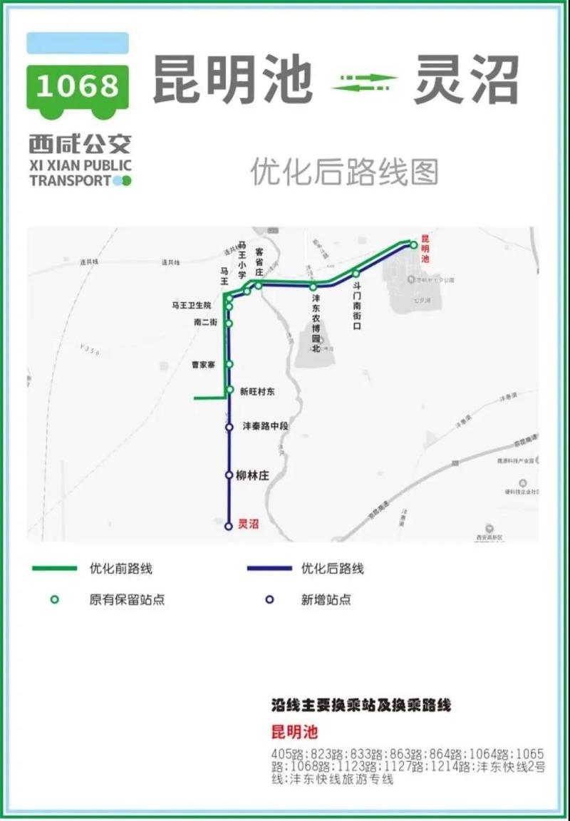 1068路,为进一步方便灵沼街办、马王街办周边群众的公交出行需求,西咸公交对1068路公交线路进行延伸,具体如下: