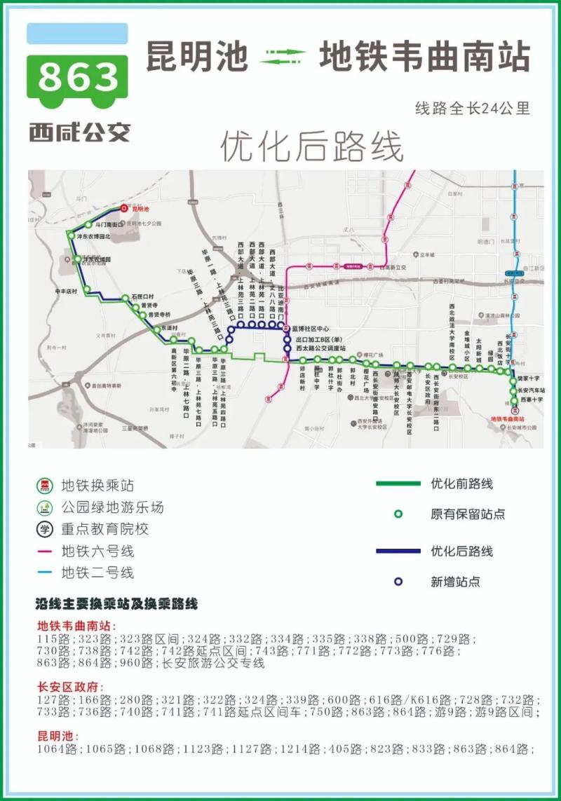 863路,为进一步加强斗门街办与西安高新区、长安区的公交连通,同时由于韦斗路道路施工,为降低运营安全隐患,西咸公交对863路(昆明池至地铁韦曲南站)进行优化调整。