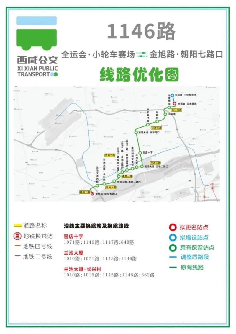 1146路,随着十四运赛事逐步展开,为满足乘客前往小轮车、马术场馆观看赛事的需求,提高公交线路覆盖率,西咸公交优化调整1146线路。