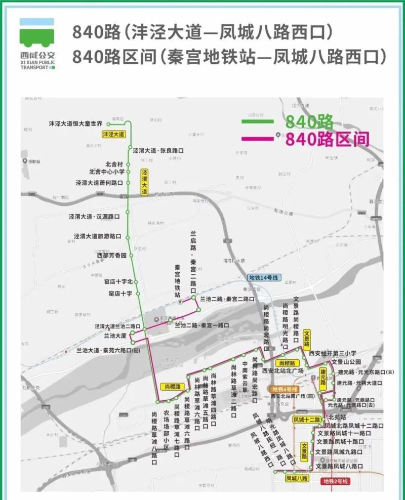 在原线路基础上新增840路区间,线路由秦宫地铁站始发,沿兰启路、秦宫二路、兰池二路、秦苑六路、兰池大道、渭河横桥行驶后恢复原线路行驶。