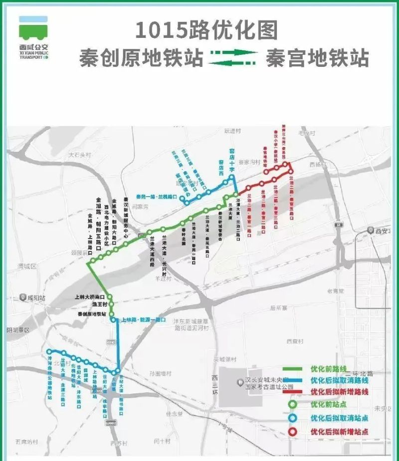 优化后,线路首末站原沣河森林公园地铁站调整至秦创原地铁站,由秦创原地铁站始发,沿上林路、金旭路、兰池大道、秦苑六路、兰池二路、秦宫五路、兰启路行驶至秦宫地铁站。
