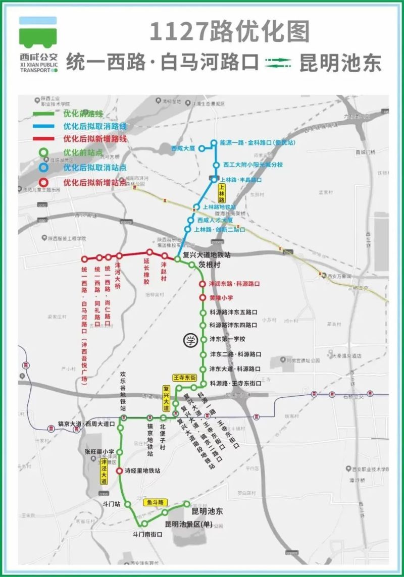 优化后,原线路首末站西咸大厦站调整至统一西路·白马河路口(沣西吾悦广场),由统一西路·白马河路口(沣西吾悦广场)始发,沿统一路、科源路恢复原线路行驶至昆明池景区。
