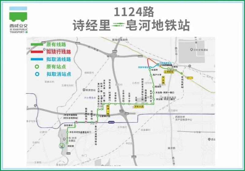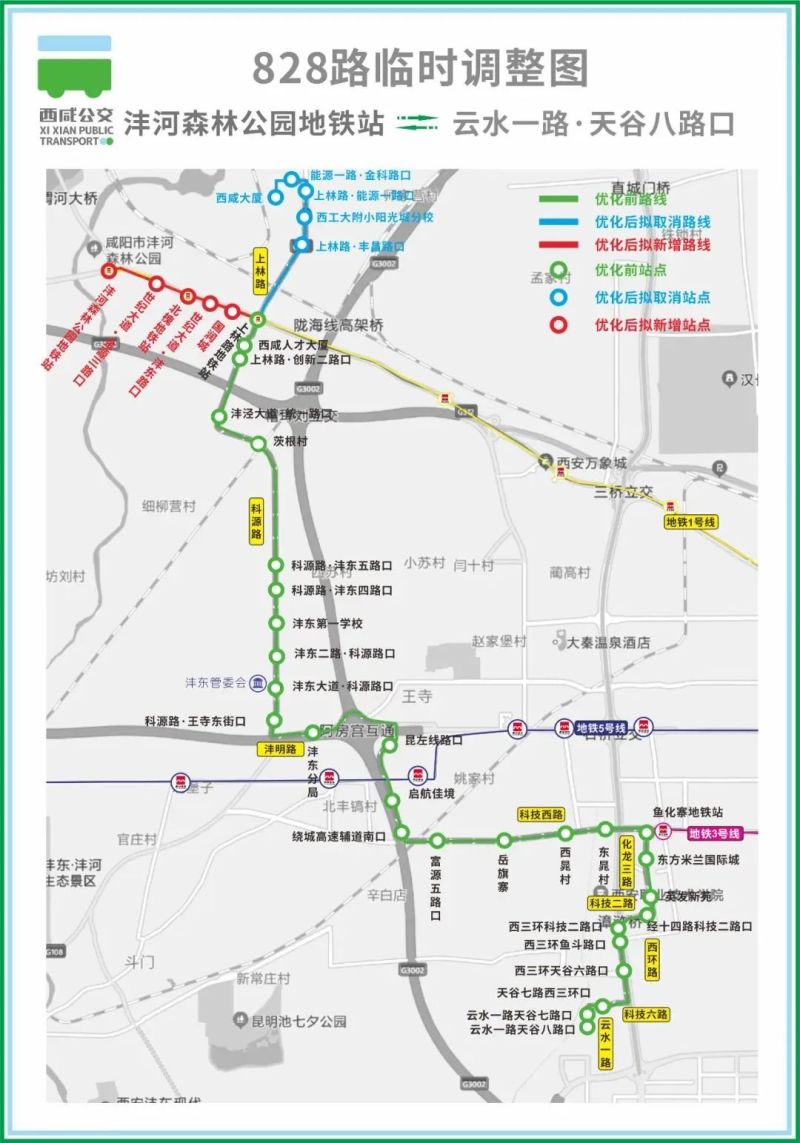 临时新增停靠站点:国润城、世纪大道·沣东路口、北槐地铁站、世纪大道·金源三路口、沣河森林公园地铁站。