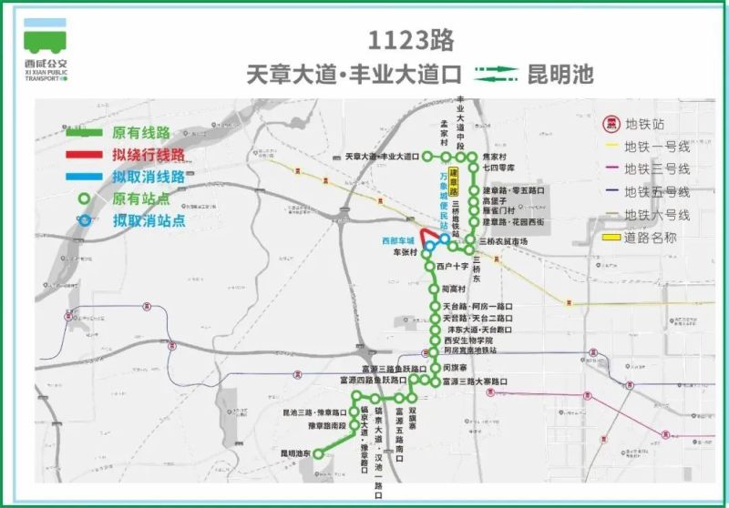 1123路由天章大道·丰业大道口开往昆明池方向,需绕行后卫寨转盘右转至天台路,现恢复原线路通行。
