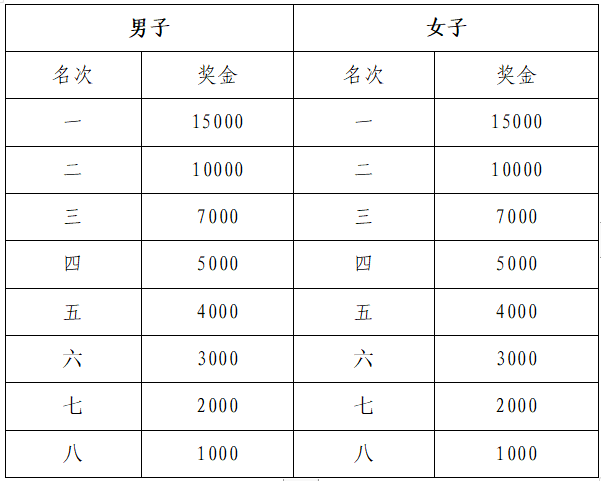 总成绩男/女前五名的选手(前五名按枪声成绩),分别获得奖金: