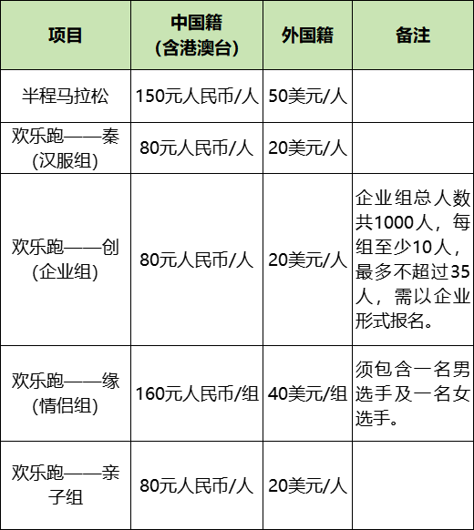 1.半程马拉松项目限报6000人,欢乐跑-秦(汉服组)限报1000人,欢乐跑-创(企业组)限报1000人、欢乐跑-缘(情侣组)限报500组、欢乐跑亲子组限报1000人。除企业组各项目报名人数超过限报名额后,参赛资格获取将采取抽签+候补退出机制的办法。